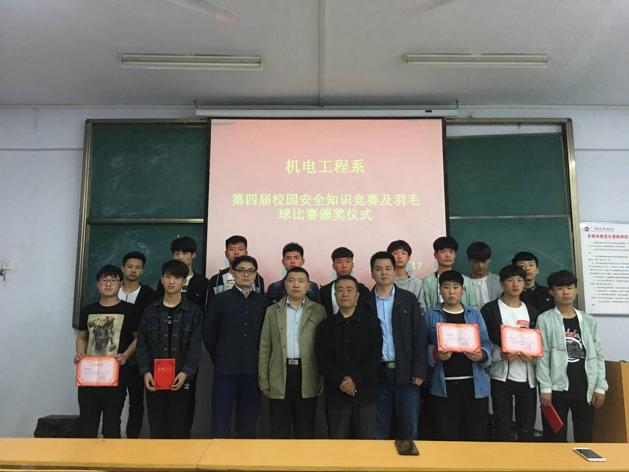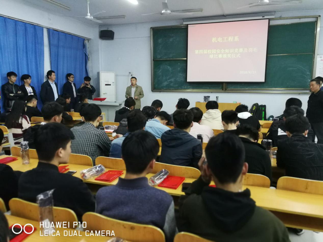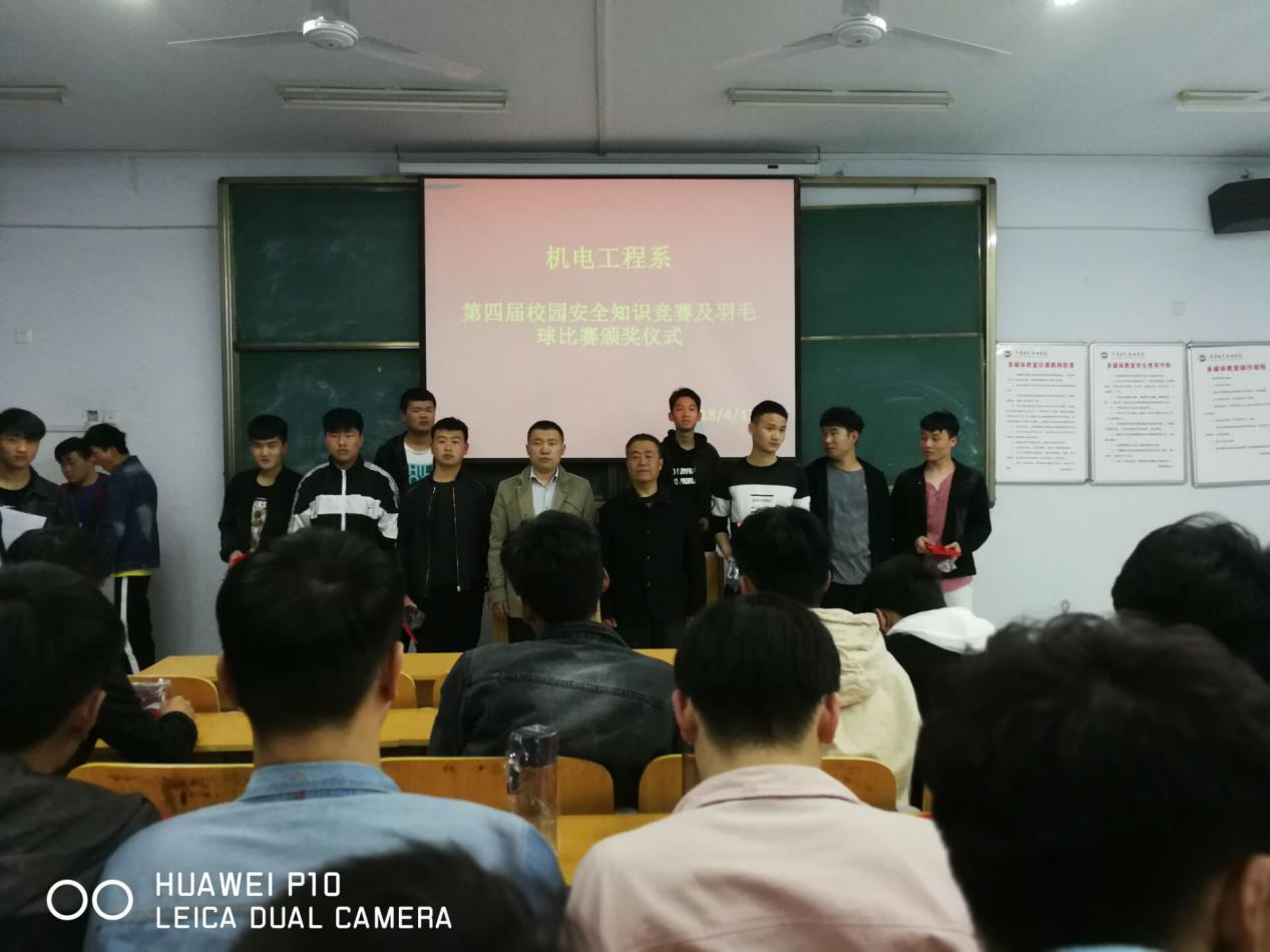 2018年4月17日晚,機電工程系在教學樓A410召開第四屆安全知識競賽暨羽毛球比賽表彰大會。機電系負責人張紅凱、馮振華,系學生科老師王會峰、徐亞龍分別為獲得各項比賽一、二、三等獎選手頒獎。