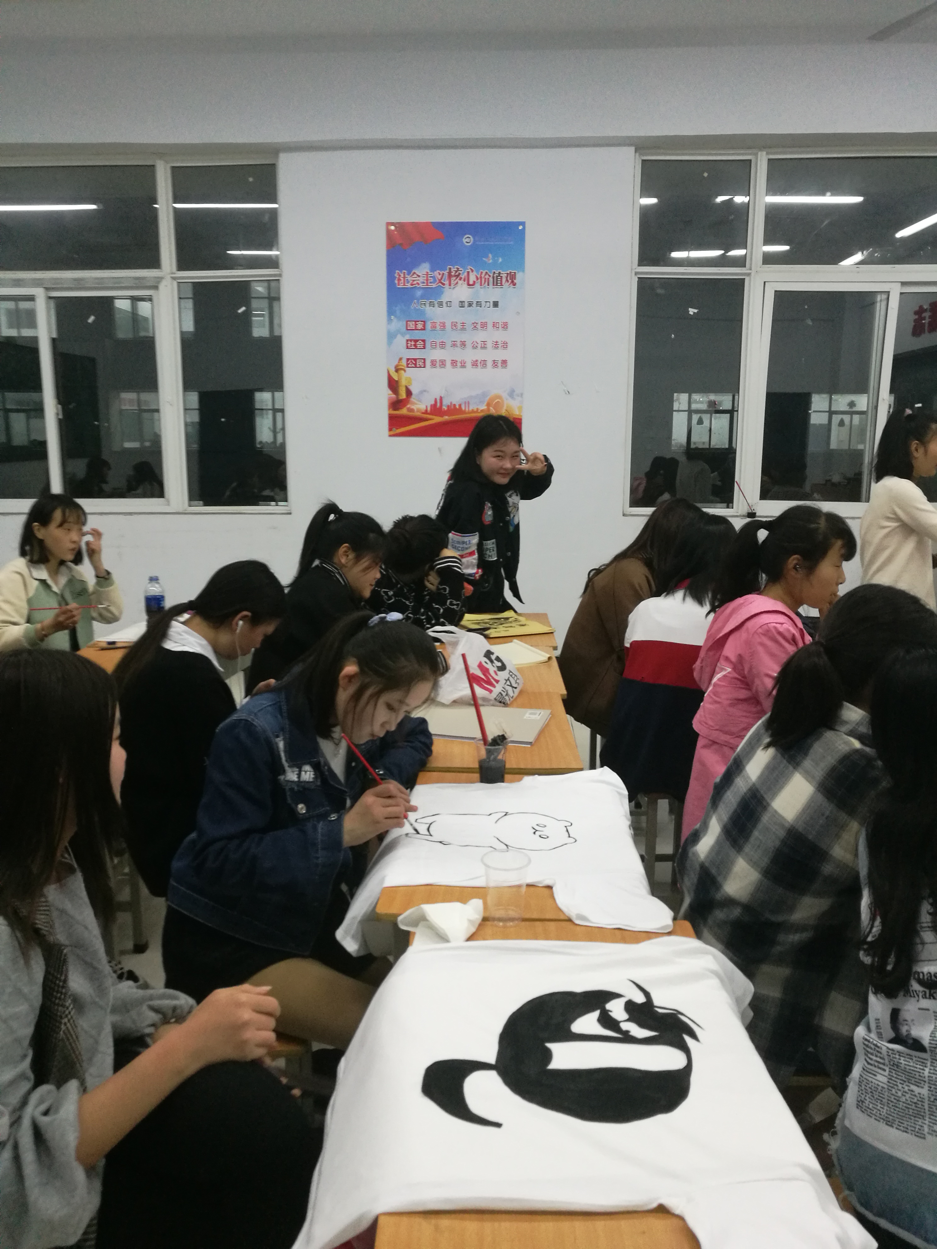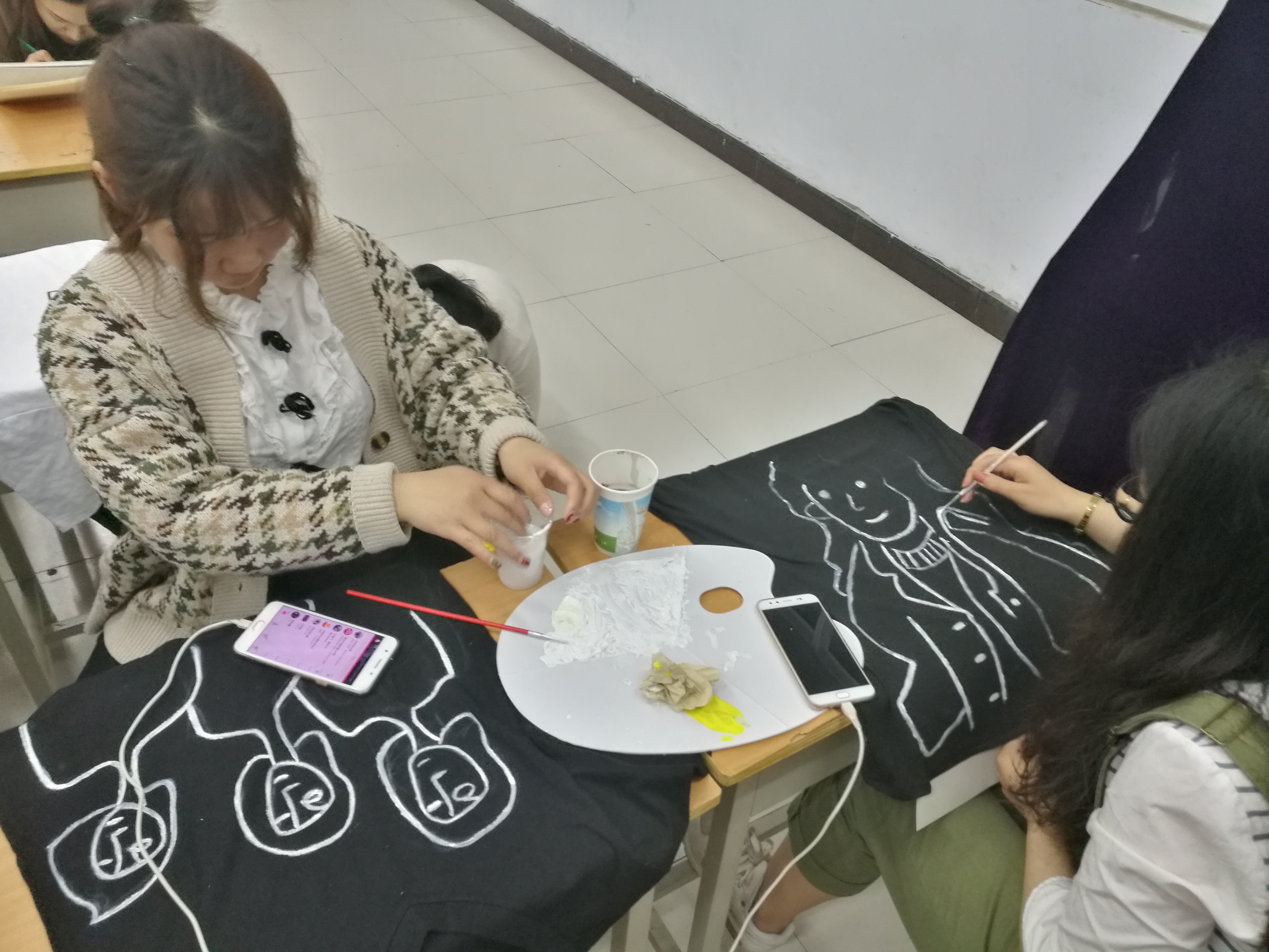 同學(xué)們提前兩周就開始了各項(xiàng)準(zhǔn)備工作:在網(wǎng)上采購(gòu)黑白兩色的T恤、搜集和設(shè)計(jì)自己的T恤圖案、班委同學(xué)購(gòu)買顏料和畫筆,經(jīng)過將近兩周的準(zhǔn)備,4月12日下午,在同學(xué)們的期待中活動(dòng)正式開始。活動(dòng)伊始,同學(xué)們?cè)缭绲木蛠淼浇淌遥瑪[放所需用品。活動(dòng)開始后,同學(xué)們紛紛拿起了手中的畫筆,開始聚精會(huì)神地制作屬于自己的T恤。活動(dòng)現(xiàn)場(chǎng),同學(xué)們個(gè)個(gè)全神貫注地描繪著自己的作品,設(shè)計(jì)著專屬于自己的圖案,同學(xué)們選擇的圖案有的簡(jiǎn)潔明快,有的萌萌可愛,有的個(gè)性十足。