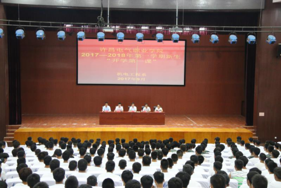 為豐富校園文化內涵,讓新同學明確新學習生活的定位, 感悟和踐行工匠精神, 2017年9月18日下午3點半,在許昌電氣職業(yè)學院會議中心,機電工程系組織開展了隆重的2017級新生“開學第一課”活動,院黨委委員、副院長馮朝印出席、機電工程系主任張紅凱及有關科室負責人參加,活動由機電工程系副主任馮振華主持。