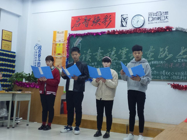 本次團會以兩位同學分享的讀書心得和讀書體會為啟幕。分別對同學們分享了自己對于圖書的熱愛及對讀書時的真實感受,引起了大家的共鳴。接下來的小游戲環(huán)節(jié)“名著接龍”同學們踴躍參加,一度把晚會的氣氛推向高潮。在同學們興奮之余,由四位同學演講的詩朗誦《我讀書,我成長,我快樂》使在場的所有同學都置身于暢游書海的歡樂之中,再次讓團會推向高潮。
