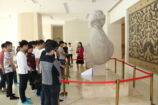 許昌博物館新館位于許昌市東城區(qū)許都路與智慧大道交叉口的許昌文博館南區(qū),距離我院有5分鐘車程,據(jù)講解員介紹該館于2011年5月建成投入使用,屬國家級二級館。博物館(含地下文物庫房)建筑面積21384.75平方米,為省級大型博物館,分為三層,每層高7.2米。其館藏文物有6304件,劃分為13個類別,即陶器、瓷器、碑貼、字畫、古籍、銅器、錢幣、鐵器、石器、石刻、磚瓦、玉器、雜項。具有特色的藏品是磚瓦類,特別是中型不空心畫像磚獨具特色,瓷器、銅器藏品也別具一格,典型器物有:“上人馬食太倉”畫像磚、“陽遂富貴大吉利”磚、銅鈹、蓮花口喇叭座白釉瓶。在參觀過程中,矗立于博物館二樓大廳的”石辟邪”引起了同學(xué)們的注意,久久不肯離開,石辟邪是古代的一種神獸,用于辟除邪祟。該石像建造于東漢,殘高202.2、長230.8、寬101厘米,系用整塊青石雕鑿而成,瞠目張口,昂首挺胸,頸部有鬣,肩生雙翼,胸臂部肌肉豐滿,體魄健壯,整體形象渾厚凝重,如虎似獅,是漢代石雕藝術(shù)的精品。由于歷史原因,石像腿部、頭部等部位殘缺,但更加給人以豐富的聯(lián)想,有斷臂維納斯之感。