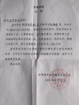 近日,機(jī)電工程系20級(jí)工業(yè)機(jī)器人專業(yè)學(xué)生汪瑞明收到中國(guó)共產(chǎn)主義青年團(tuán)許昌市建安區(qū)委員會(huì)的感謝卡和志愿服務(wù)證明,對(duì)汪瑞明不畏艱辛、勇于擔(dān)當(dāng)、主動(dòng)參與疫情工作表示感謝和贊揚(yáng),對(duì)我院培養(yǎng)出如此有責(zé)任、有擔(dān)當(dāng)?shù)膶W(xué)生表示由衷感謝。
