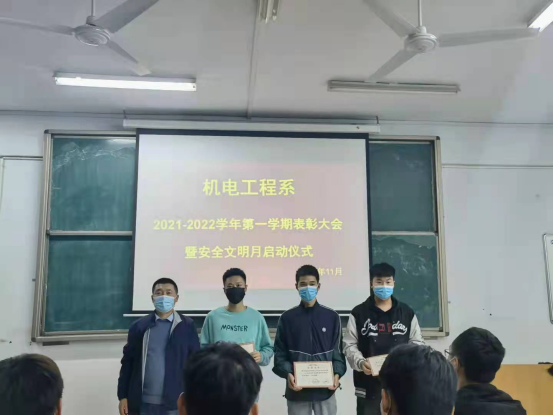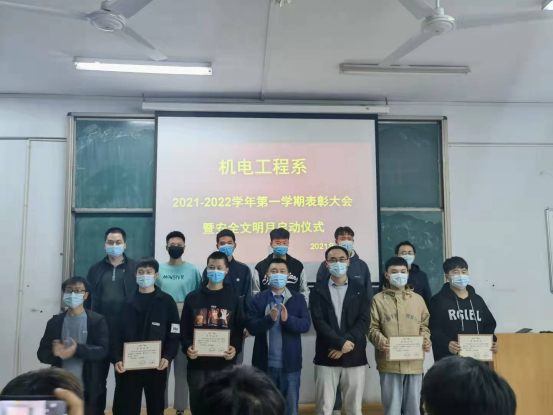 為表彰先進,樹立典型,全面提升學生的安全文明意識,機電工程系于11月4日下午6:30在教學樓A411教室召開了“機電工程系2021-2022學年第一學期表彰大會暨安全文明月啟動儀式”。本次受表彰的先進集體及個人有:2020級機電一體化高職1班等3個河南省先進班集體,沈世超、馬夢然等6名河南省三好學生,2021年度迎新先進個人及新生趣味活動周獲獎人員。機電工程系負責人馮振華、院學生處卜偉松老師、系學生科王會峰老師、系團總支杜羽老師、系學管會指導老師程文浩出席了本次大會。