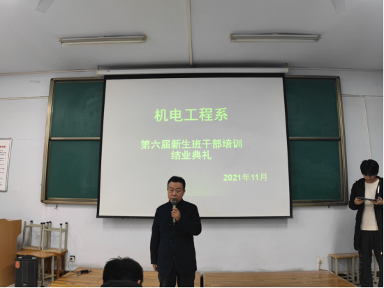 11月30日,機(jī)電工程系在教學(xué)樓A411舉行新生學(xué)生干部培訓(xùn)班結(jié)業(yè)典禮,對(duì)班干培訓(xùn)學(xué)員進(jìn)行表彰總結(jié),機(jī)電工程系負(fù)責(zé)人張紅凱、馮振華,系團(tuán)總支杜羽老師,系學(xué)生科王會(huì)峰老師、程文浩老師出席本次結(jié)業(yè)典禮。