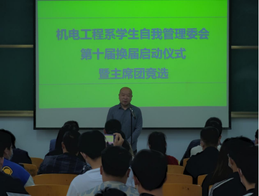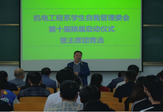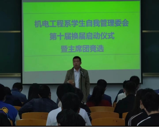 4月18日,機(jī)電工程系學(xué)生自我管理委員會(huì)在教學(xué)樓A411舉行第十屆學(xué)生自我管理委員會(huì)換屆啟動(dòng)儀式暨第十屆學(xué)管會(huì)主席團(tuán)競(jìng)選,機(jī)電工程系黨總支書(shū)記劉建剛,系主任張紅凱、馮振華及院系學(xué)生管理老師和輔導(dǎo)員代表出席了本次大會(huì),參與此次大會(huì)的還有21級(jí)各班班長(zhǎng)和競(jìng)選主席團(tuán)的14位學(xué)管會(huì)成員。