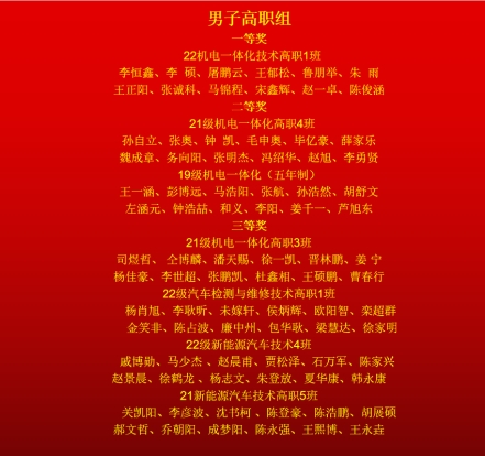 經(jīng)過初賽、復(fù)賽、半決賽、總決賽的激烈角逐,此次拔河比賽共評出男子高職組一等獎1個、二等獎2個、三等獎3個,男子中職組一等獎1個、二等獎2個、三等獎2個,女生組一等獎1個、二等獎1個、三等獎1個,優(yōu)秀獎11個,優(yōu)秀輔導(dǎo)老師7名。系黨總支書記劉建剛、系主任張紅凱、系團(tuán)總支書記杜羽、系學(xué)生科科長王會峰及系學(xué)生科程文浩老師為獲獎隊伍授予了錦旗并合影留念。