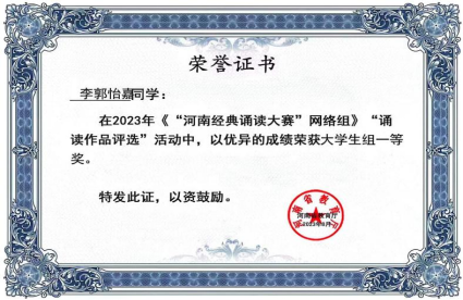 傳承優(yōu)秀傳統(tǒng)文化,增強(qiáng)文化自信。在2023 年河南經(jīng)典誦讀大賽(網(wǎng)絡(luò)組)比賽中,藝術(shù)系22級學(xué)前教育2班三名學(xué)生取得了優(yōu)異的成績。其中李郭怡嘉作品《梅花》榮獲一等獎,盧改玲作品《四季》、張文寧作品《中華少年》榮獲二等獎。