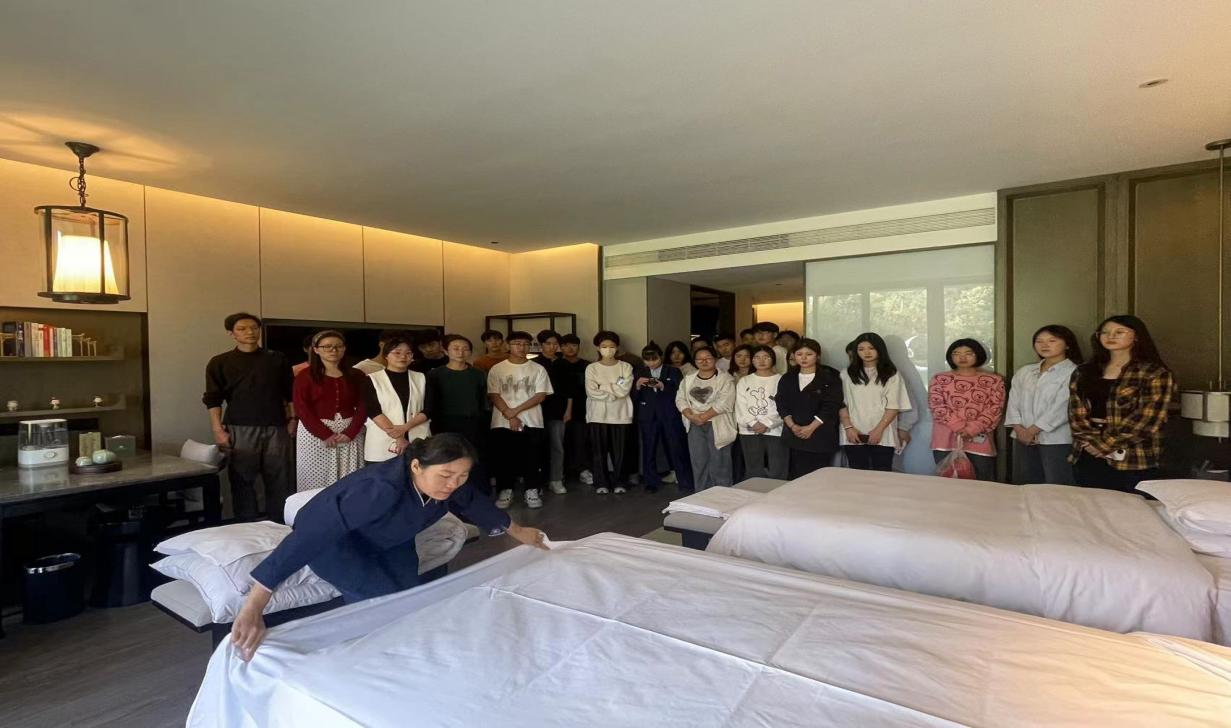 活動中,瑞貝卡芙蓉園酒店行政人力資源辦公室主任張鴻鈞對酒店品牌建設(shè)、價值戰(zhàn)略等向?qū)W生進(jìn)行了詳細(xì)介紹,并帶領(lǐng)學(xué)生參觀了紫薇書院、荷塘月色餐廳、芙蓉廳、宴會廳、瑞泉樓、知園、崇朗樓等場館,進(jìn)行了中式擺臺、中式鋪床現(xiàn)場展示。