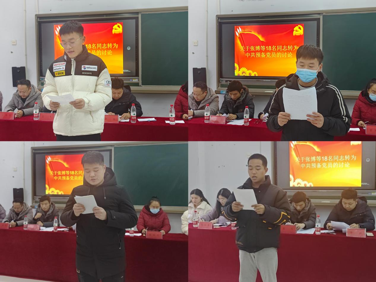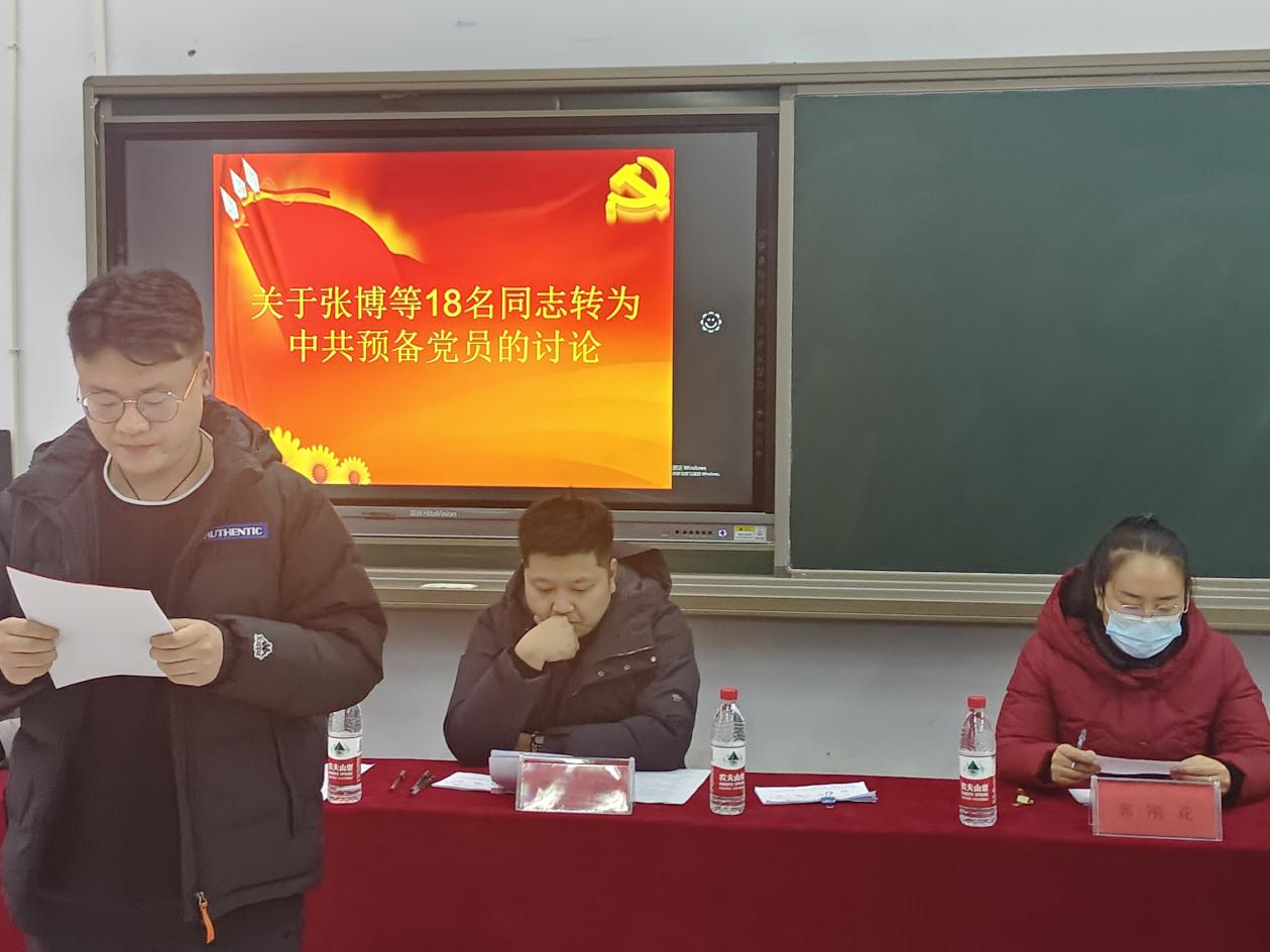 之后全體黨員進(jìn)行討論,充分發(fā)表意見并投票表決。王琨陽了宣讀投票結(jié)果,支部大會(huì)通過表決投票認(rèn)為張博等18名發(fā)展對(duì)象基本具備預(yù)備黨員條件,同意接收為預(yù)備黨員。
