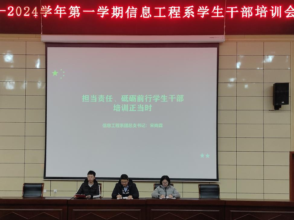 為明確學生干部的職責,增強學生干部的全局意識、服務意識、責任意識,切實發(fā)揮其在學習、生活中的作用,12月13日,信息工程系在第二報告廳舉行了2023-2024學年第一學期學生干部培訓會。信息工程系黨總支副書記王旭、團總支書記宋尚霖、學生科全體老師及全系學生干部參加會議,會議由辛柳主持。