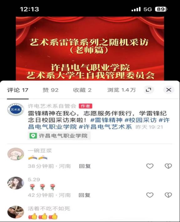 采訪活動結(jié)束后,藝術(shù)系抖音平臺實時分享了該活動的開展,其瀏覽量突破了1.4萬, 切實做到了讓更多的同學了解雷鋒精神,傳承雷鋒精神。