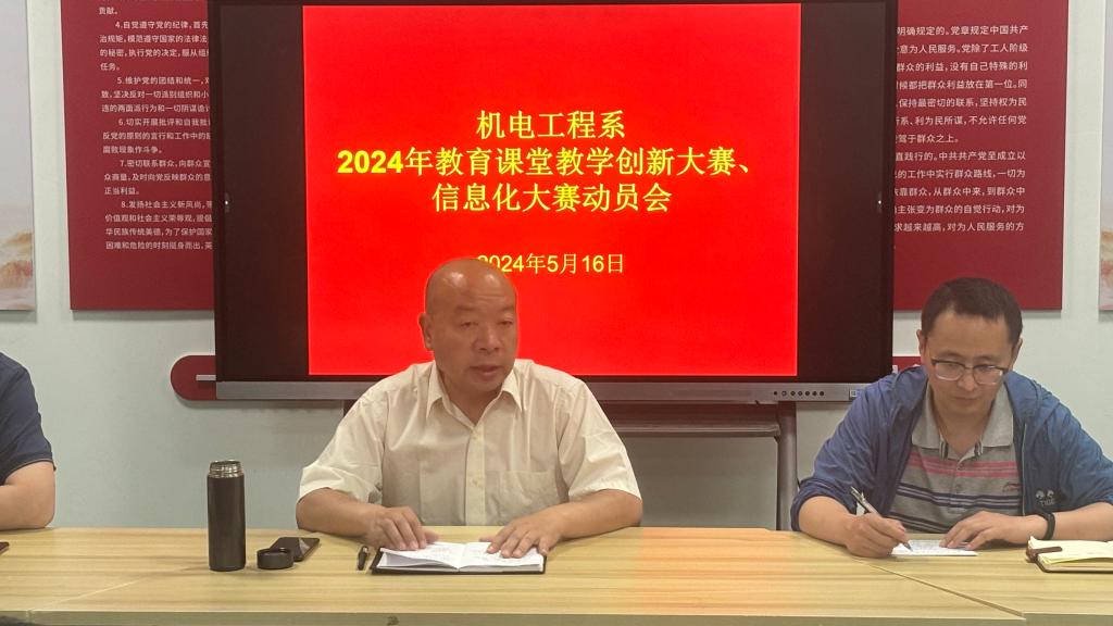 為提升教師教育教學(xué)水平,激發(fā)教師參與競賽的積極性,引導(dǎo)青年教師在日常教學(xué)科研活動中立先進(jìn)標(biāo)尺,樹先鋒形象,5月16日下午,機(jī)電工程系在黨建陣地召開2024年課堂教學(xué)創(chuàng)新大賽、信息化大賽動員會。會議由系黨總支書記劉建剛主持,系部在競賽中獲得突出成績的教師和2023年、2024年在系部從事教育教學(xué)工作的新進(jìn)教師共同參加會議。