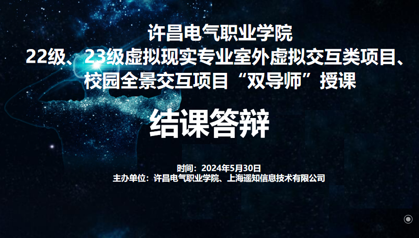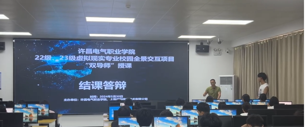 5月30日上午,信息工程系虛擬現(xiàn)實(shí)技術(shù)應(yīng)用專業(yè)與上海遙知信息技術(shù)有限公司校企聯(lián)合“雙導(dǎo)師”授課在訓(xùn)A二樓VR實(shí)訓(xùn)室正式開展結(jié)課答辯活動,22級、23級全體虛擬現(xiàn)實(shí)技術(shù)應(yīng)用專業(yè)學(xué)生參與本次活動,活動由虛擬現(xiàn)實(shí)技術(shù)應(yīng)用專業(yè)負(fù)責(zé)人李紅亞主持。