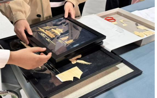踏入楊麗工作室,古色古香的工作臺上金絲般的麥秸拼貼出山河脈絡(luò),空氣中浮動著麥香與礦物顏料的沉靜氣息。“從蒸煮軟化到刮絲拋光,每根麥秸需歷經(jīng)十二道工序方能成為藝術(shù)載體。”楊麗手持半成品麥秸畫,向師生們展開了一堂生動的非遺技藝課。