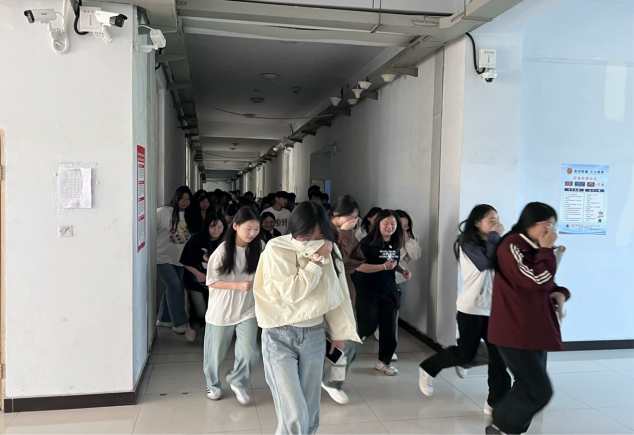 演練開始,警報聲驟然響起,煙霧四起,同學們迅速起身跑向安全出口。他們用手捂住口鼻,彎腰低姿前行,按照預定的疏散路線,緊張有序地撤離到安全區(qū)域。現(xiàn)場志愿者在各個關(guān)鍵位置沉著指揮,確保每位同學都能安全到達室外空曠地點。整個疏散過程有條不紊,充分展現(xiàn)了同學們良好的應急反應能力。