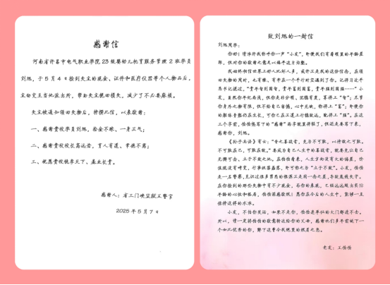 這面錦旗和感謝信,不僅是對(duì)劉旭個(gè)人的褒獎(jiǎng),更激勵(lì)著全體師生在踐行社會(huì)主義核心價(jià)值觀的道路上不斷前行。這起拾金不昧的事件,雖然看似普通,卻如同一顆閃耀的星星,照亮了校園的每一個(gè)角落,傳遞著滿滿的正能量,讓我們看到了當(dāng)代大學(xué)生的責(zé)任與擔(dān)當(dāng),也讓我們堅(jiān)信,在文明的校園里,溫暖與善良從未缺席。