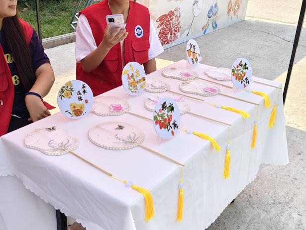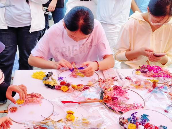 活動現(xiàn)場設(shè)置兩大核心區(qū)域,體驗區(qū)中,手工制作的熱烈氛圍撲面而來。非遺工坊志愿者在香包制作與非遺香料研發(fā)中,四種不同配方的混合香料被巧妙運用,結(jié)合現(xiàn)代工藝制成具有多樣功效的產(chǎn)品,既傳承了傳統(tǒng)香道文化,又滿足了當代生活需求;在干花團扇制作區(qū),學生們以扇面為畫布,將永生花、滿天星等材料錯落拼貼,搭配燙金扇骨,傳統(tǒng)團扇煥發(fā)時尚新貌。