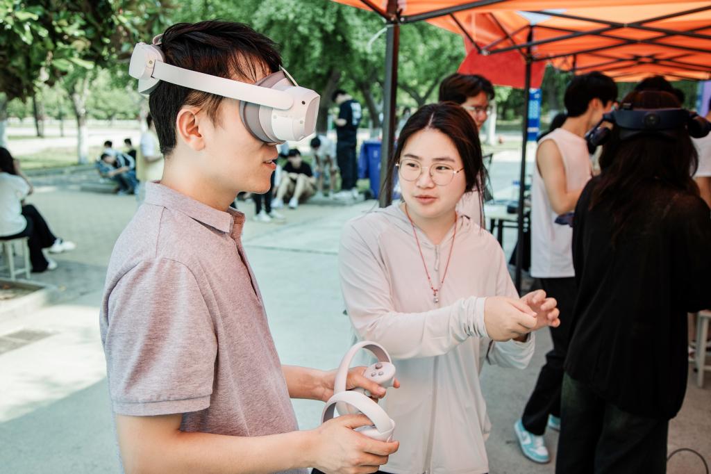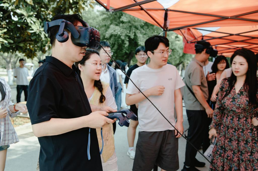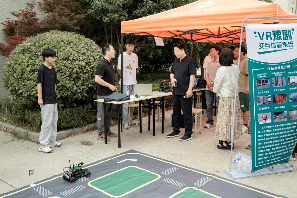 由虛擬現(xiàn)實(shí)和數(shù)字媒體學(xué)生團(tuán)隊(duì)開發(fā)的VR項(xiàng)目成為全場(chǎng)焦點(diǎn)。師生可沉浸式體驗(yàn)“三國”歷史文化場(chǎng)景、豫劇文化交互系統(tǒng)或進(jìn)入許電火災(zāi)模擬逃生系統(tǒng)等,感受虛擬現(xiàn)實(shí)技術(shù)在文化傳承與職業(yè)教育中的應(yīng)用。
