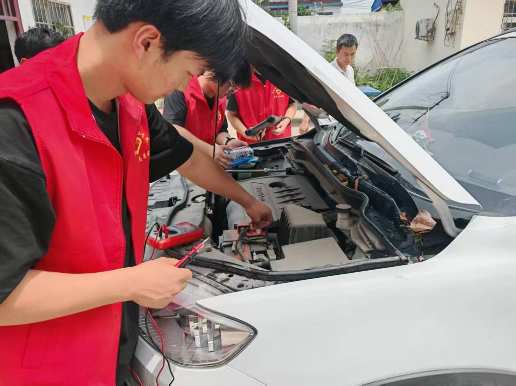“師傅,幫我看看剎車油夠不夠?”在汪店村的村委大院,程文浩、樊偉和陳陽陽老師帶領(lǐng)學生們分組協(xié)作,為村民提供全方位的汽修檢查服務(wù)。從發(fā)動機艙的“三液”檢查,到輪胎胎壓監(jiān)測,再到燈光系統(tǒng)檢測,志愿者們用專業(yè)的技術(shù)踏實做服務(wù),打通汽修志愿服務(wù)“最后一公里”。
