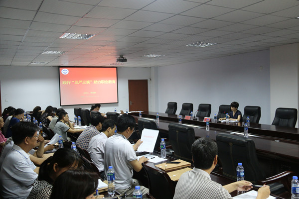 在學(xué)習(xí)研討會上,楊德嶺院長首先致辭講話,指出了學(xué)院內(nèi)部各單位存在的“不嚴(yán)不實(shí)”十種表現(xiàn)形式,要求領(lǐng)導(dǎo)干部都要身體力行,通過集中學(xué)習(xí)研討,進(jìn)一步提升干部隊(duì)伍的思想素質(zhì)、政治素質(zhì)、工作能力、政策水平,知責(zé)任、長本領(lǐng)、守紀(jì)律,更好的帶領(lǐng)全院職工為學(xué)院更好更快發(fā)展獻(xiàn)計(jì)獻(xiàn)策。紀(jì)委書記徐翠琴通過引領(lǐng)學(xué)習(xí)黨章及省紀(jì)委書記《用好紀(jì)律這把鋼尺》,結(jié)合實(shí)際,做了《用紀(jì)律這把鋼尺“量”自己的言行》的專題報(bào)告。副院長商淑敏結(jié)合市政府關(guān)于職業(yè)教育發(fā)展戰(zhàn)略規(guī)劃,做了《踐行“三嚴(yán)三實(shí)”,助力職業(yè)教育》的專題報(bào)告。