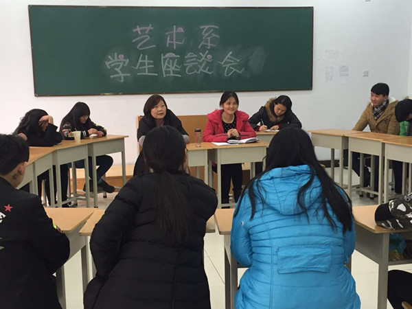 一個(gè)學(xué)期已經(jīng)過半,學(xué)生們對(duì)新環(huán)境的適應(yīng)情況和對(duì)課程的接受情況都讓藝術(shù)系的每一位老師掛心。在12月14日,由我系負(fù)責(zé)人閻瑾瑜、董淑紅主持,班主任路慶敏和學(xué)生科管理教師白鴿參會(huì),在401教室與15工業(yè)設(shè)計(jì)班的學(xué)生們進(jìn)行了一次深入的交流。