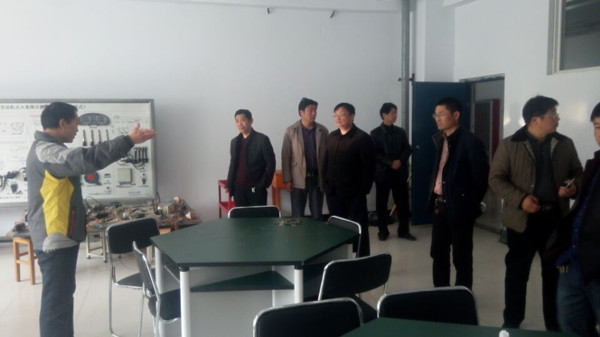三所學校的領(lǐng)導(dǎo)和教師代表,在劉濤、陳武以及招生就業(yè)處同志的陪同下,參觀了學院的實習場地。學院實訓處的張紅衛(wèi)老師向來訪老師詳細介紹了汽修專業(yè)學生的實習流程、實訓設(shè)備的功能、操作等。
