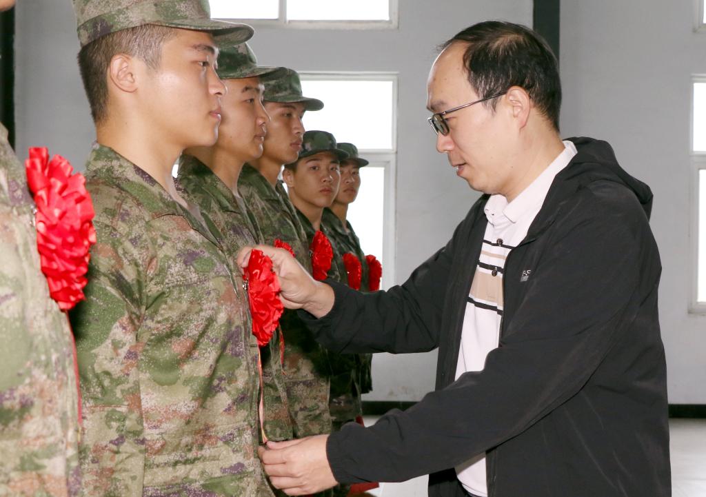 儀式結(jié)束后,歡送人員為入伍大學生佩戴大紅花、發(fā)放紀念品并合影留念。