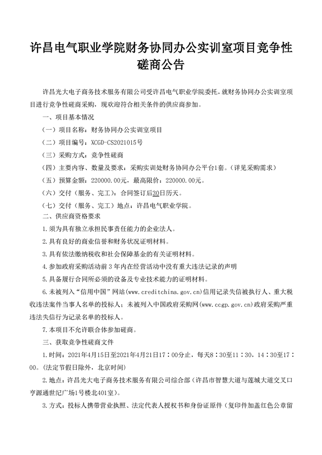 上一條:許昌電氣職業(yè)學院“室內(nèi)設計施工工藝展示實訓室項目”競爭性談判公告