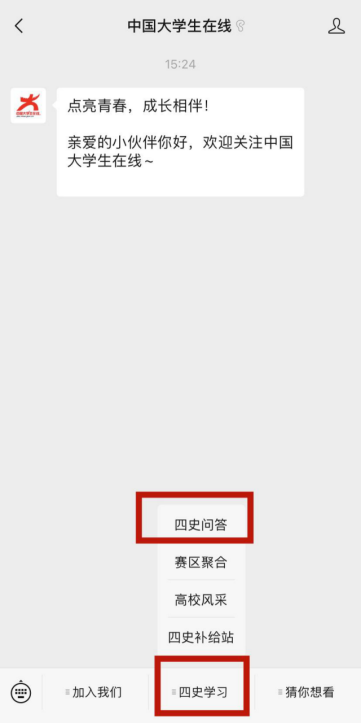 關(guān)注“中國大學生在線”微信公眾號,點擊菜單欄“服務(wù)”,即可跳轉(zhuǎn)至“四史學習”界面(如下圖)