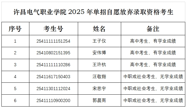 根據(jù)《許昌電氣職業(yè)學(xué)院2025年單獨(dú)招生工作實(shí)施方案》相關(guān)規(guī)定及工作流程,經(jīng)考生本人申請、招生就業(yè)處審核,現(xiàn)對截至2025年4月27日18時(shí)自愿放棄錄取資格的6名考生信息予以公示,名單如下: