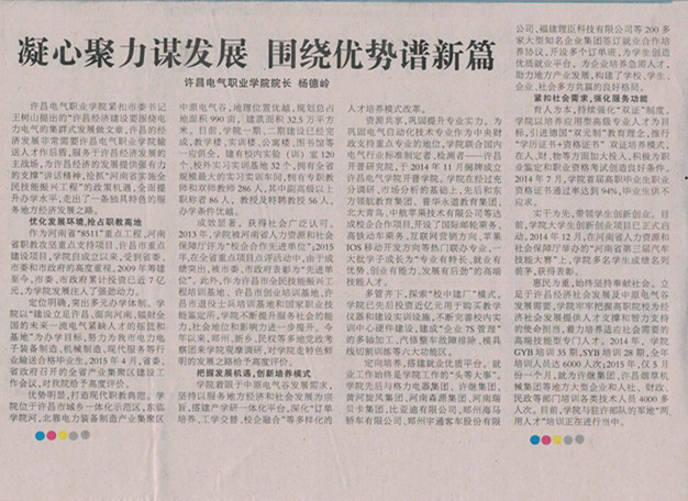 【編者按】 《許昌日?qǐng)?bào)》2015年6月8日第2版“要聞?民生”欄目全文刊發(fā)院長(zhǎng)楊德嶺的文章《凝心聚力謀發(fā)展 圍繞優(yōu)勢(shì)譜新篇》,全文如下: