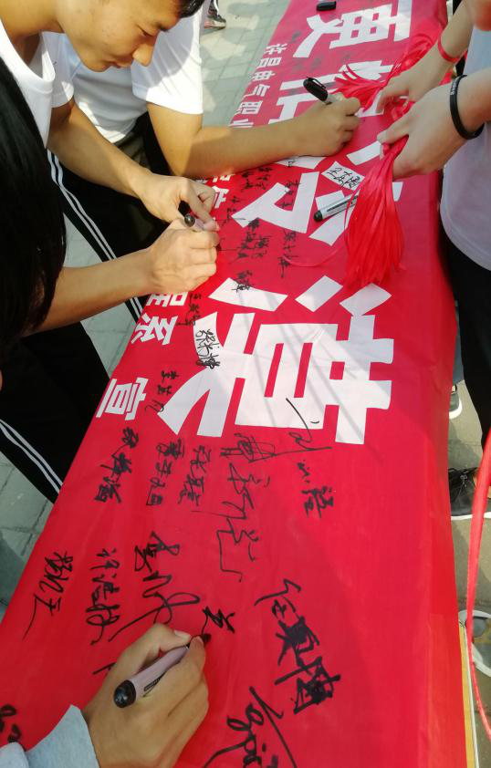 活動現(xiàn)場,設(shè)有海報展示,告訴同學(xué)們什么是艾滋病,怎樣預(yù)防,眾多同學(xué)在橫幅上寫下自己的名字,并積極佩戴紅絲帶,也為活動現(xiàn)場增添了不少亮色。師生紛紛駐足,瀏覽海報展板、參與相關(guān)活動,現(xiàn)場氣氛熱烈。