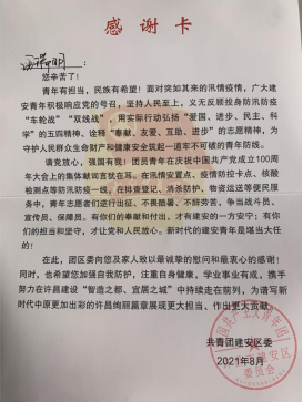 近日,機(jī)電工程系20級(jí)工業(yè)機(jī)器人專業(yè)學(xué)生汪瑞明收到中國(guó)共產(chǎn)主義青年團(tuán)許昌市建安區(qū)委員會(huì)的感謝卡和志愿服務(wù)證明,對(duì)汪瑞明不畏艱辛、勇于擔(dān)當(dāng)、主動(dòng)參與疫情工作表示感謝和贊揚(yáng),對(duì)我院培養(yǎng)出如此有責(zé)任、有擔(dān)當(dāng)?shù)膶W(xué)生表示由衷感謝。