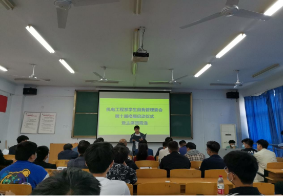 4月18日,機(jī)電工程系學(xué)生自我管理委員會(huì)在教學(xué)樓A411舉行第十屆學(xué)生自我管理委員會(huì)換屆啟動(dòng)儀式暨第十屆學(xué)管會(huì)主席團(tuán)競(jìng)選,機(jī)電工程系黨總支書(shū)記劉建剛,系主任張紅凱、馮振華及院系學(xué)生管理老師和輔導(dǎo)員代表出席了本次大會(huì),參與此次大會(huì)的還有21級(jí)各班班長(zhǎng)和競(jìng)選主席團(tuán)的14位學(xué)管會(huì)成員。