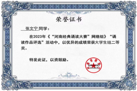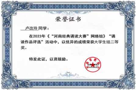 傳承優(yōu)秀傳統(tǒng)文化,增強(qiáng)文化自信。在2023 年河南經(jīng)典誦讀大賽(網(wǎng)絡(luò)組)比賽中,藝術(shù)系22級學(xué)前教育2班三名學(xué)生取得了優(yōu)異的成績。其中李郭怡嘉作品《梅花》榮獲一等獎,盧改玲作品《四季》、張文寧作品《中華少年》榮獲二等獎。