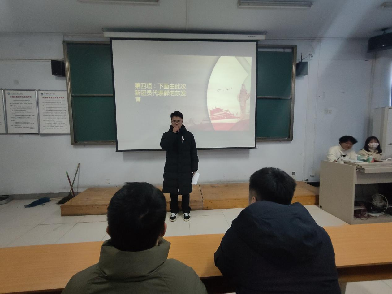 隨后,新團員代表郭浩東同學(xué)發(fā)表演講,他表示,作為一名共青團員,應(yīng)全心向黨,以青春之熱血、青春之干勁,肩負起國家和民族的希望,在黨的領(lǐng)導(dǎo)下,與時代同心同向同行,踔厲奮發(fā),篤行不怠;志存高遠,腳踏實地,用奮斗點燃夢想,在新時代留下青春奮斗的鮮明印記,踐行"請黨放心,強國有我"的錚錚誓言!