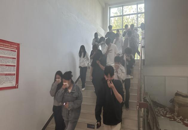 演練開始,警報聲驟然響起,煙霧四起,同學們迅速起身跑向安全出口。他們用手捂住口鼻,彎腰低姿前行,按照預定的疏散路線,緊張有序地撤離到安全區(qū)域。現(xiàn)場志愿者在各個關(guān)鍵位置沉著指揮,確保每位同學都能安全到達室外空曠地點。整個疏散過程有條不紊,充分展現(xiàn)了同學們良好的應急反應能力。